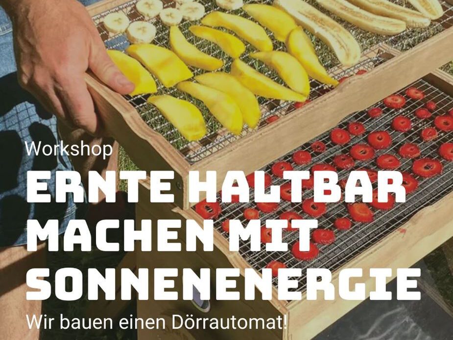 Geernteten Früchten Feuchtigkeit zu entziehen ist ein uralter Weg, das Verderben von Lebensmitteln aufzuhalten und die Ernte so haltbar zu machen. Wir schauen uns gemeinsam an, wie wir das ohne Strom hinkriegen und was es so alles zu beachten gibt. Gemeinsam bauen wir einen Solar-Dörrautomat, den sich jede*r bei uns ausleihen kann, um aus der eigenen Ernte mithilfe von Spätsommer-Sonne einen leckeren Wintervorrat zu machen.