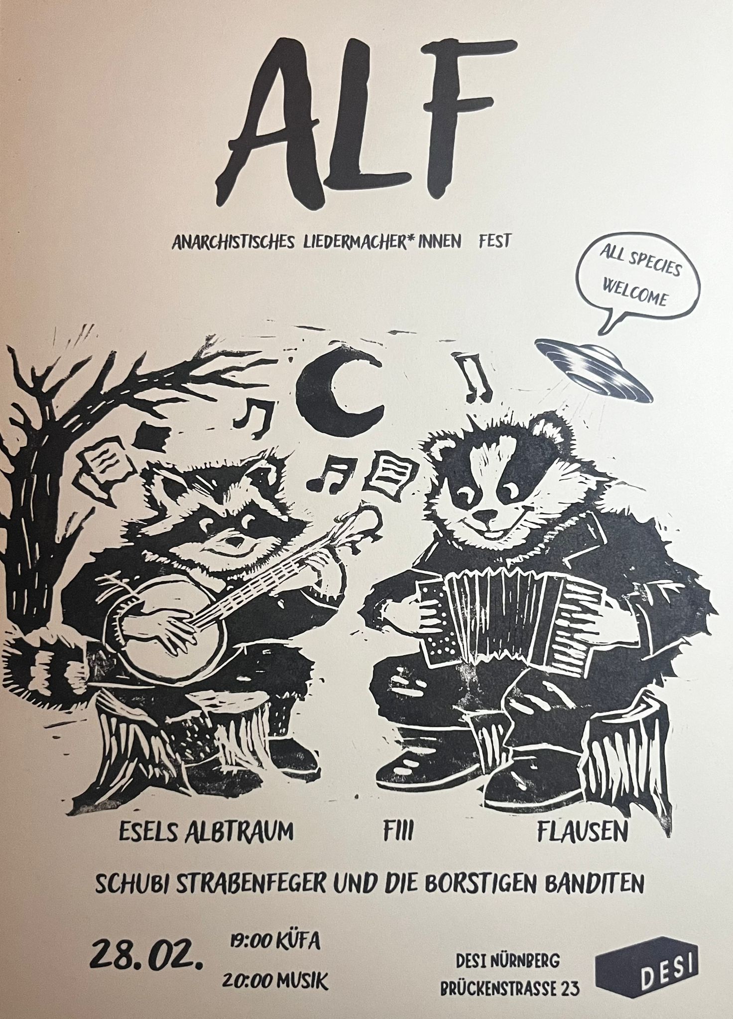 28 Februar Samstag ALF – Anarchistisches Liedermacher:innen Fest19:00Desi Stadtteilzentrum e.V. Desi Stadtteilzentrum e.V.Konzert, Küfa, WorkshopDetails