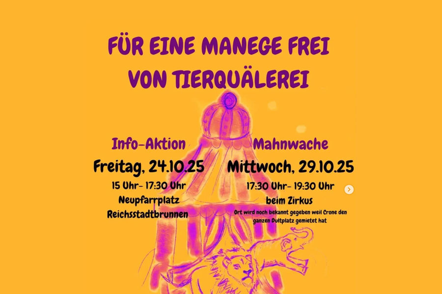 Setzt ein Zeichen gegen diese Tierquälerei und kommt zu folgenden Aktionen: InfostandWann? Freitag, 24.10.25 von 15 bis 17:30 UhrWo? Am Neupfarrplatz MahnwacheWann? Mittwoch, 29.10.25 von 17:30 bis 19:30 UhrWo? Beim Zirkus (genauer Ort wird noch bekannt gegeben) (Text der Veranstaltenden) Jetzt teilen: