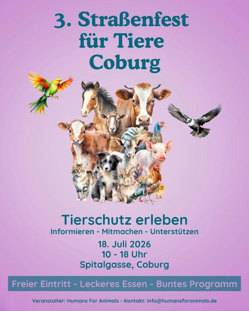 Das Straßenfest für Tiere in Coburg geht in die 3. Runde! 🥁 🐾 Nach dem großen Erfolg der letzten beiden Jahre feiern wir wieder gemeinsam das Straßenfest für Tiere – ein fröhliches, buntes Fest, das ganz unseren tierischen Freunden gewidmet ist. 🐥🐄🐖🐕🐈🐇🐓🦔🐑🐠🐞🐝 Freut euch auf einen Tag voller Informationen, inspirierender Gespräche und Aktionen für die […]