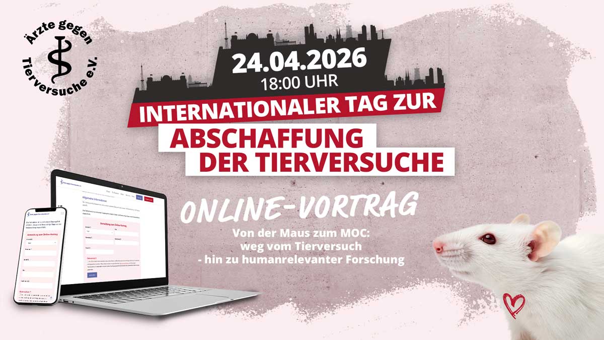 24 April Freitag Online-Vortrag „Von der Maus zum MOC: weg vom Tierversuch – hin zu humanrelevanter Forschung“18:00 – 19:00Online Ärzte gegen Tierversuche e.V.Online, VortragDetails