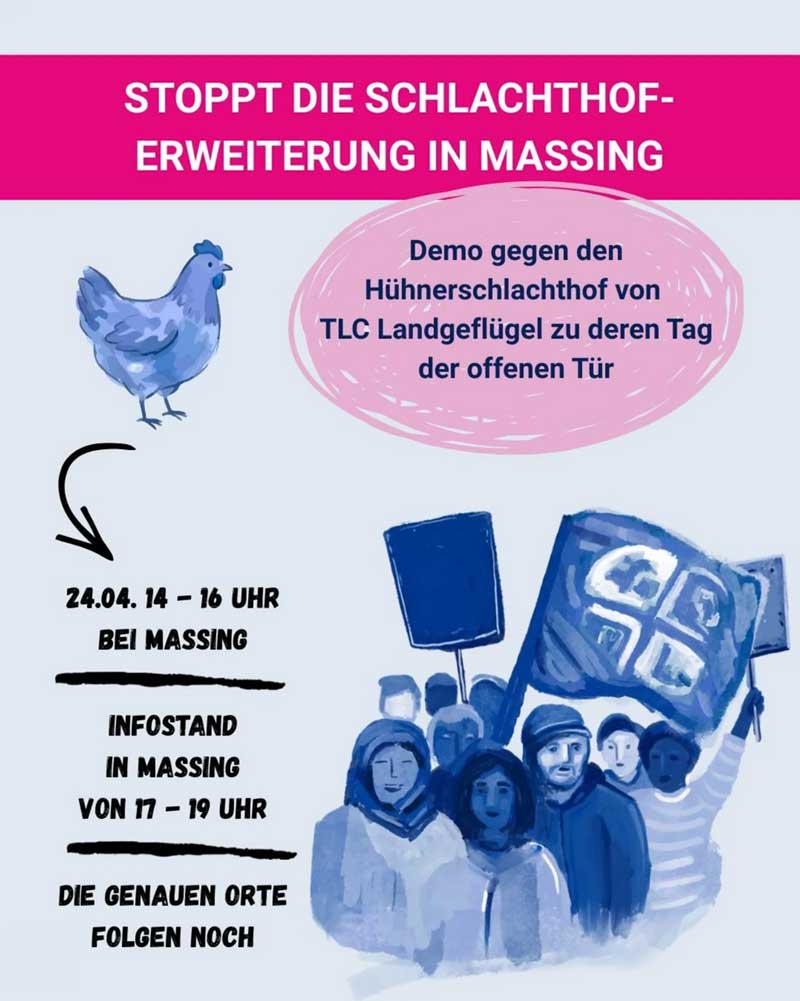 24 April Freitag Demo und Infostand gegen den Schlachthof von TLC Landgeflügel14:00 – 19:00 Gemeinsam gegen die Tierindustrie BayernDemonstration, InfoveranstaltungDetails