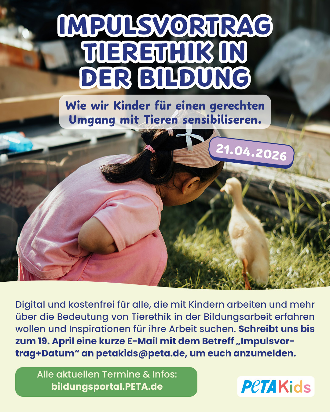 21 April Dienstag Impulsvortrag „Tierrechtsbildung: Empathie für alle Tiere fördern“19:00 – 20:30Online PETA Deutschland e.V.Online, VortragDetails