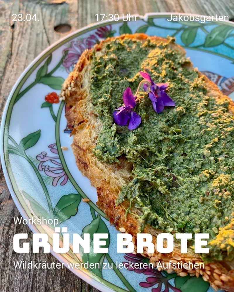 23 April Donnerstag Grüne Brote – Wildkräuter werden zu leckeren Aufstrichen17:30 – 19:30JakobsgartenWorkshopDetails